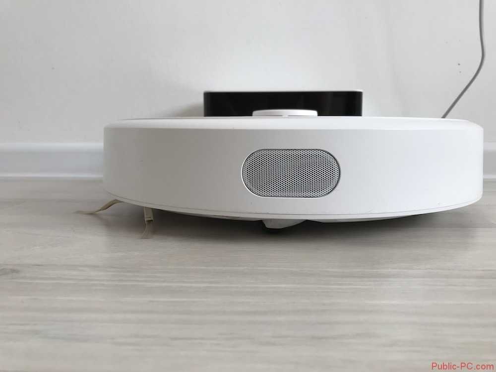 Вентиляционные решетки размещены на боковой поверхности, а в их центральной части расположились контакты для магнитной зарядки. Для предотвращения вероятности повреждения корпуса на лицевом торце присутствует защита. Это две силиконовые накладки, которые обеспечат целостность аппарата при случайном падении. Между ними установлено окно, где находится датчик поиска зарядной базы.