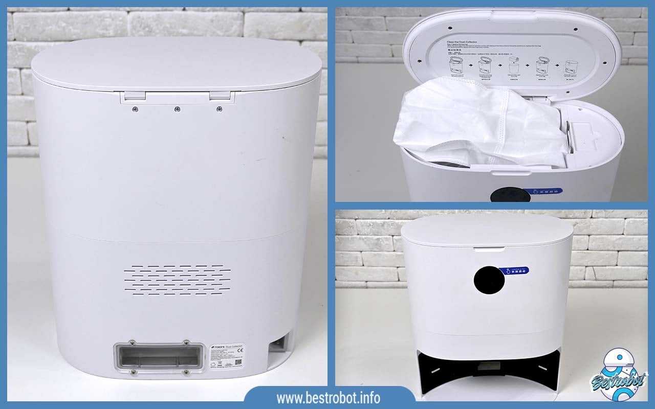 Под верхней крышкой расположен мешок и инструмент для очистки пылесборника, а также центральной щетки. Мешок вмещает до 3 литров сухого мусора. Этого хватит на 1-2 месяца эксплуатации робота-пылесоса. Под ним размещено вентиляционное отверстие двигателя, который и производит самоочистку. Сбоку размещено отверстие самого канала, через который и выгружается мусор из робота в станцию.