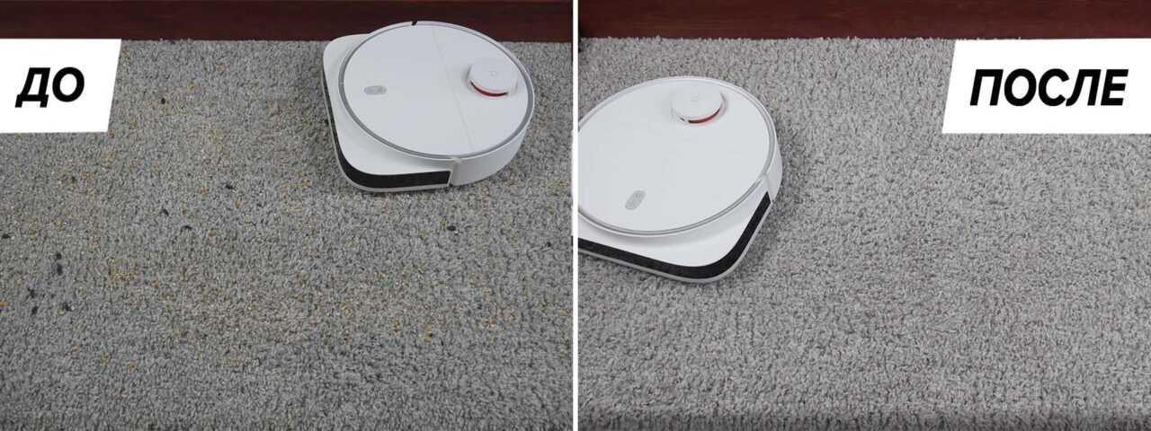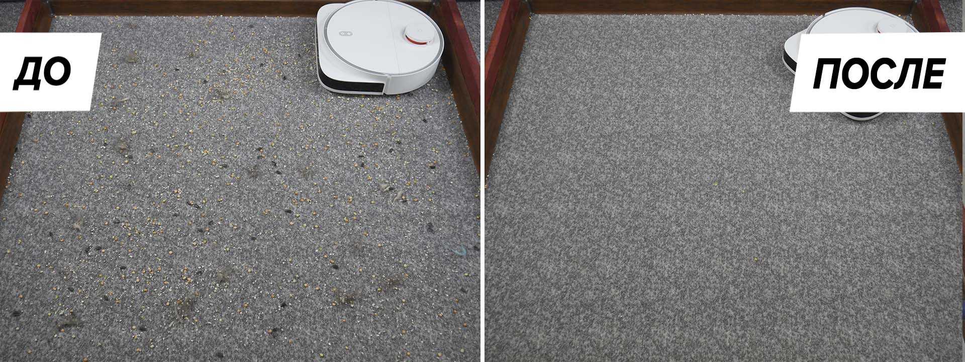 На тонком ковре большую часть работы опять сделала турбощетка, поэтому Mijia Pro показал неплохой результат – 96%. А вот торцевая щётка на ковре со своей задачей не справляется – у стен остается много соринок.