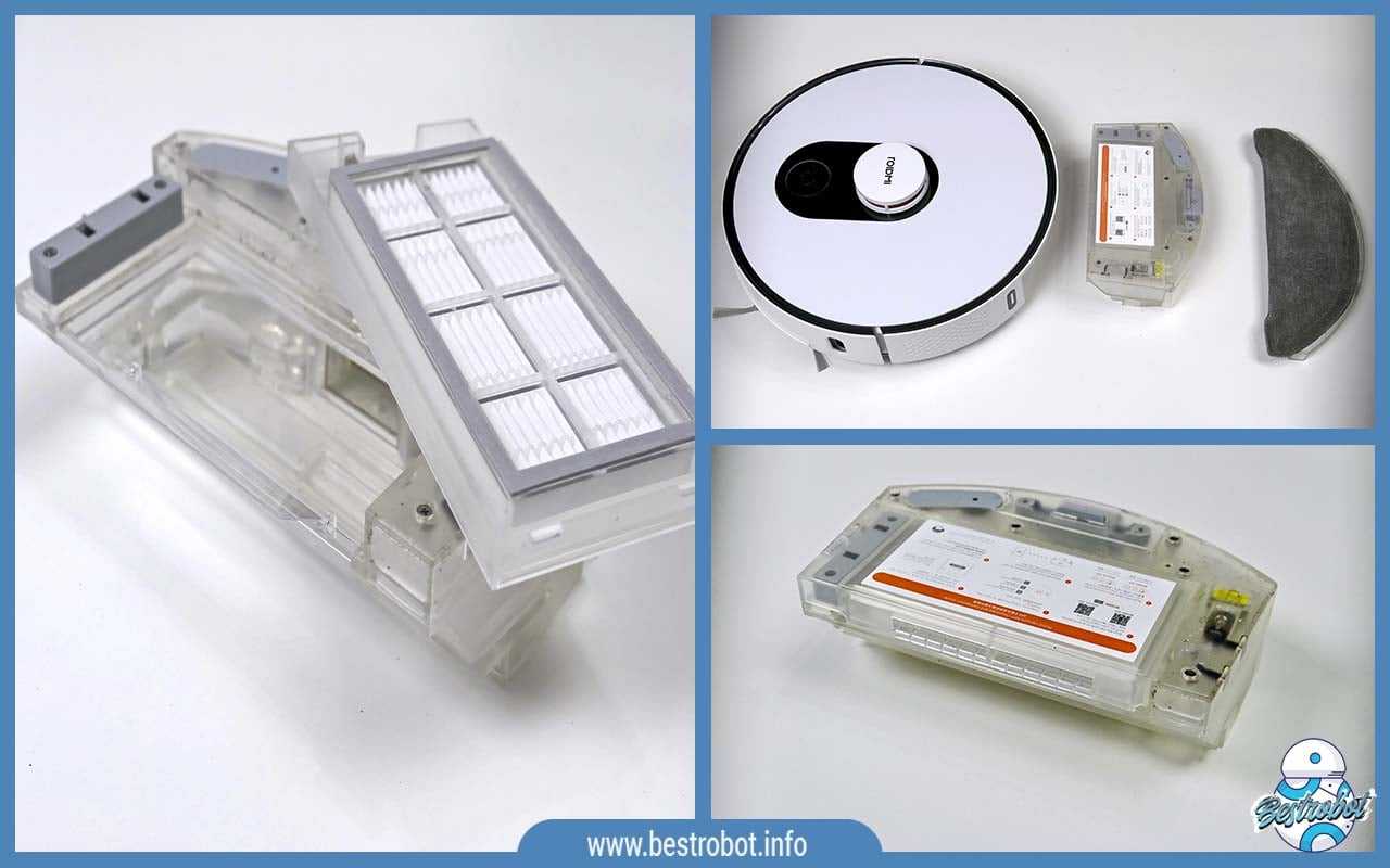 Доступ к пылесборнику осуществляется за счет снятия HEPA-фильтра. На нем также размещена информация для подключения робота к сети. Сам пылесборник оснащен шторкой, предотвращающей случайное высыпание мусора при извлечении контейнера. Вместительность пылесборника составляет 300 мл, а бака для воды 250 мл.