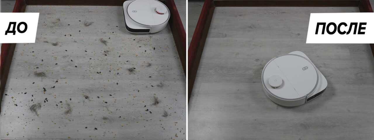 При первом проходе Mijia Pro выгребает соринки из угла и как бы растаскивает их вдоль плинтуса, а потом со второго прохода убирает начисто. В общем, D-образный корпус рулит!
