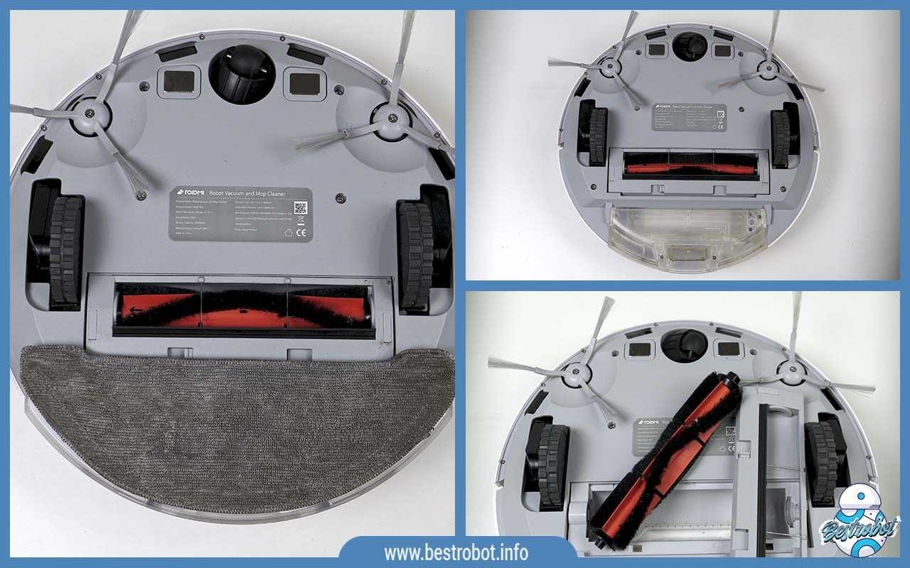 На торце устройства уместились датчики столкновения, подвижный бампер с мягкой окантовкой, отверстия вывода воздуха, зарядные контакты и совмещённый контейнер для сора (300 мл) и воды (250 мл). На дне робота нашли место пара колёс с возможностью переезда через пороги до 20 мм, колесо для баланса, центральная щётка с волнообразным рисунком и углублениями для сбора волос, две боковые щётки, а также четыре датчика высоты (для предотвращения падения с лестниц).