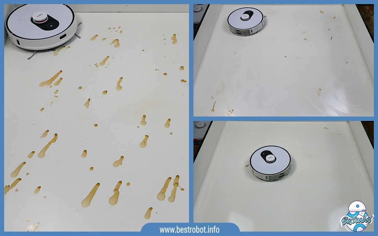 С влажной уборкой Roidmi EVE Plus справляется примерно так же, как и большинство других роботов. Мы наставили в загоне кофейных пятен, включили Y-образный режим и максимальную подачу воды. Результат оказался не очень убедительным: для оттирания пятен салфетке не хватает ни прижимной силы, ни интенсивности подачи воды, а Y-образная траектория на ограниченном участке напоминает какое-то безумие – активировать её лучше на большом пространстве.