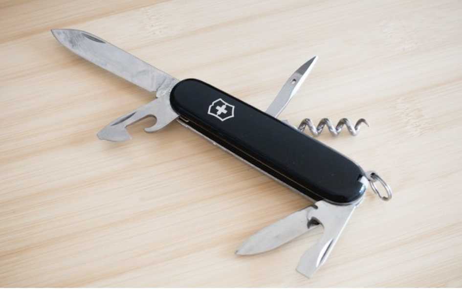Нож — важнейший из инструментов мультитула, позволяет заточить карандаш, разрезать упаковку, зачистить кабель, порезать продукты