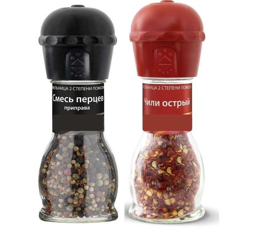Емкость, наполненная одной из специй или смесью. Она выполняется из стекла или пластика. Для перемалывания необходимо покрутить верхнюю крышку. К преимуществам такой модели относят компактность и невысокую стоимость. Но в такой мельнице уже готовый набор, поэтому когда он закончится, придется покупать новый прибор.
