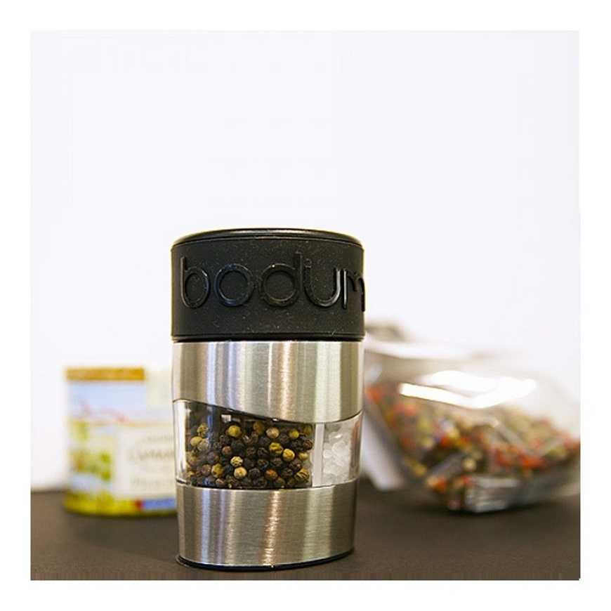 Швейцарская марка Bodum знаменита своими оригинальными решениями в производстве кухонной утвари. Мельница для соли и специй Twin этой марки состоит из двух отделов, в которых скрываются соль и специи. Жернова приводятся в действие поворотом крышки, которая одновременно является переключателем между продуктами. Корпус изделия обычно выполняется из стали, пластика или стекла, а жернова – из керамики.