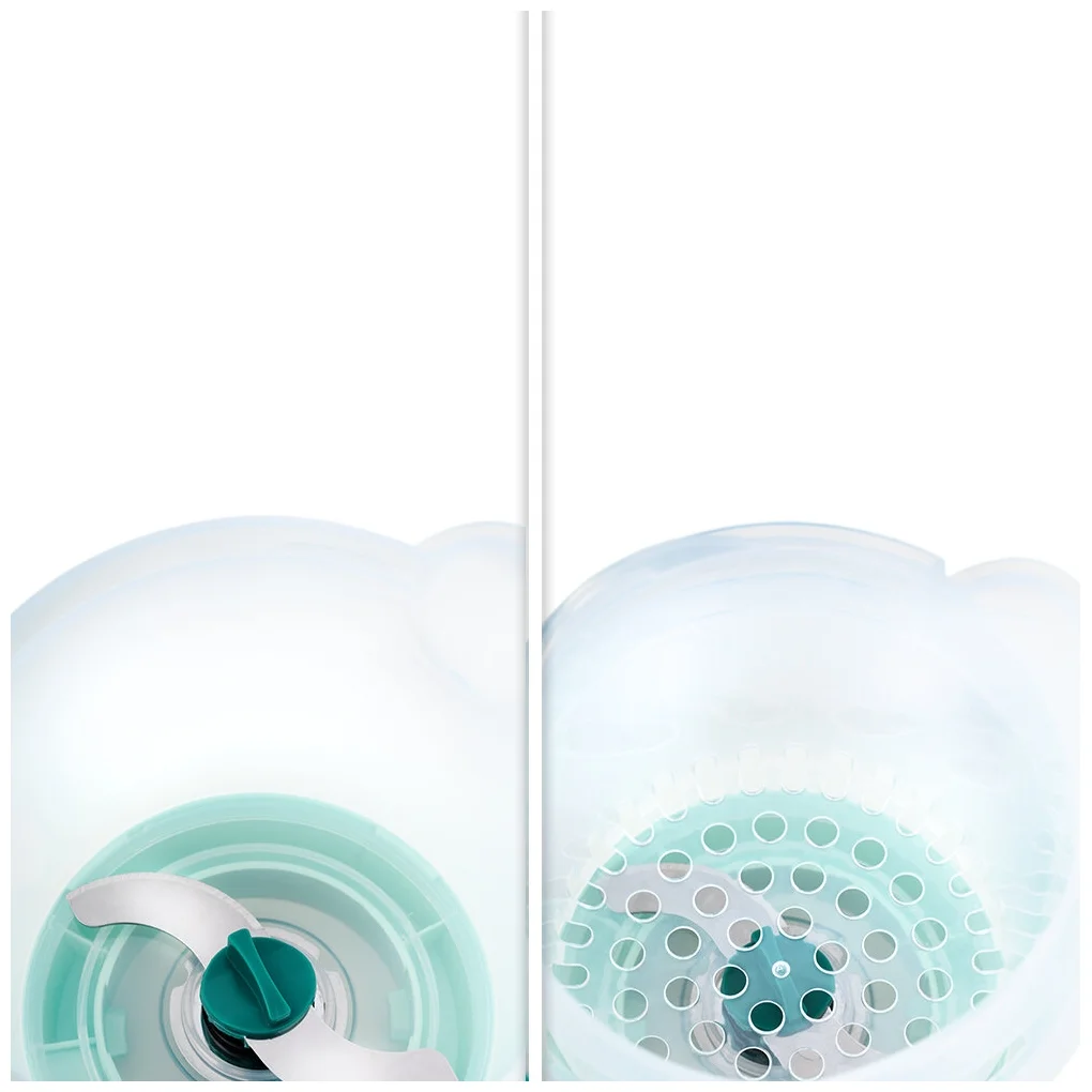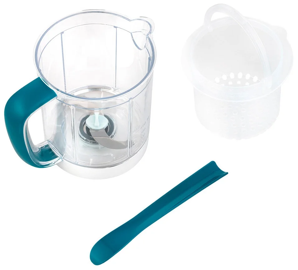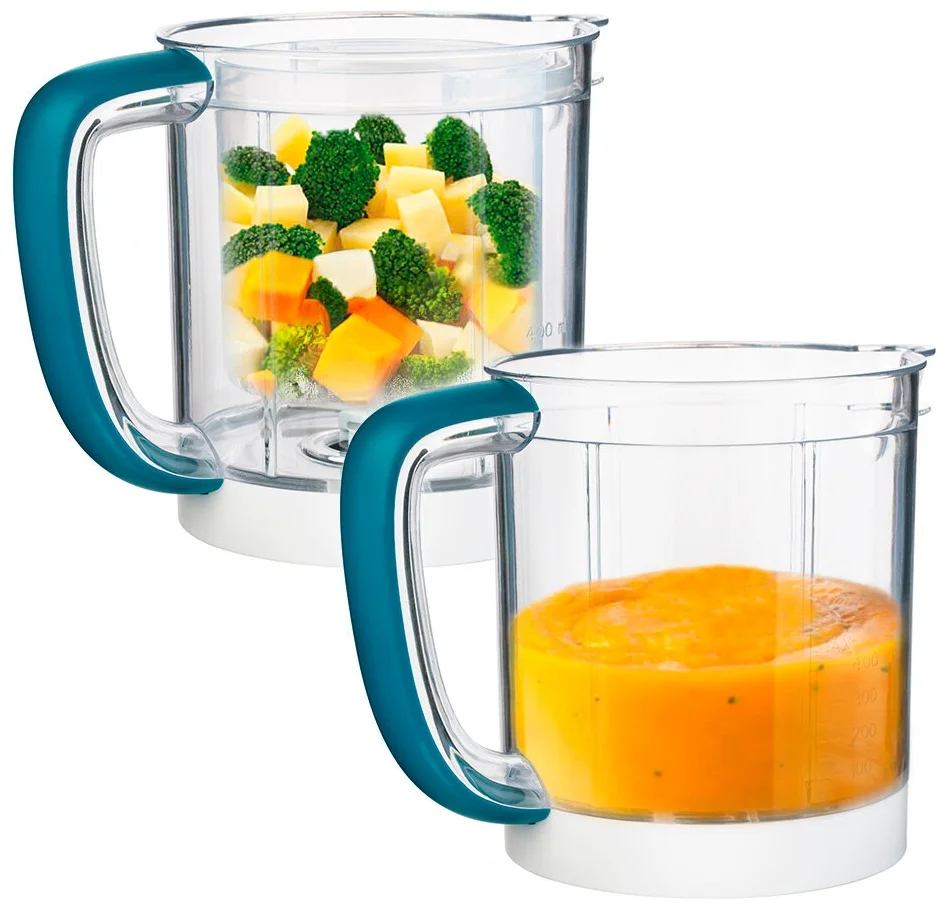 Этот детский блендер-пароварка имеет большую чашу – 850 мл, но меньшую, по сравнению с предыдущей моделью мощность – 350 Вт. Здесь главный упор сделан на объем чаши – она вместит достаточно продуктов для любого малыша, или даже двух (хорошо подойдет родителям близнецов или двойняшек).