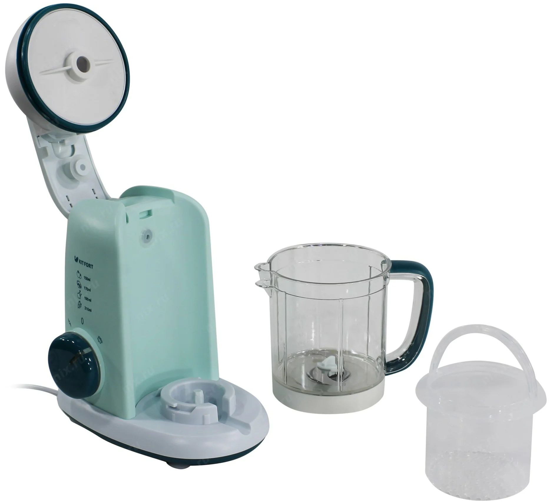 Этот блендер-пароварка имеет достаточно большую чашу, встроенный мерный стаканчик воды, а также систему автоотключения, когда еда приготовлена. Мощность у прибора небольшая – всего 350 Вт, но этого достаточно для выполнения своих четырех функций, стандартных для гибрида блендера и пароварки: размораживания, готовки на пару, измельчения и подогревания.