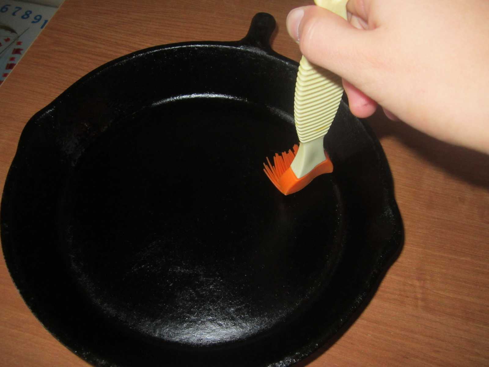 Прокалить сковородку, после остудить и кисточкой нанести подсолнечное масло по всей поверхности и бортам. Перевернуть и сунуть в духовку на 1 час. В процессе образуется много дыма. Если всё сделано правильно, внутренняя поверхность будет блестеть от впитанного жира.