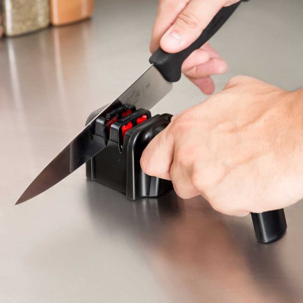 Это одна из самых небольших точилок для ножей в ассортименте бренда. Относится к механическому типу, универсальна, весит
