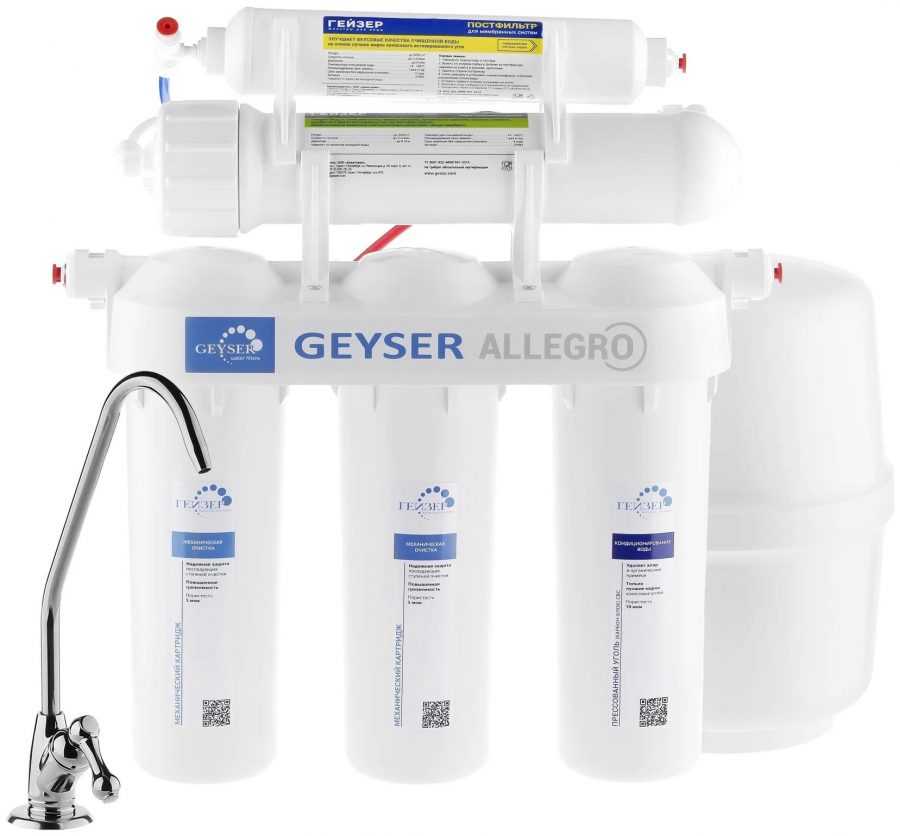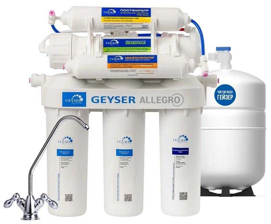 Эта небольшая модель с обратным осмосом имеет 6 ступеней очистки. По данным производителя чистая вода поставляется со скоростью 0,14 л в минуту. Для ее сбора есть небольшой бачок. Среди функций очистки стоит выделить избавление от хлора и примесей, минерализацию, механическую фильтрацию. Гейзер Аллегро — лучший недорогой вариант, который стоит выбрать для установки под раковину. Производитель доработал ресурс работы, увеличив сроки эксплуатации. Пользователями модель ценится за функциональность и надежность.