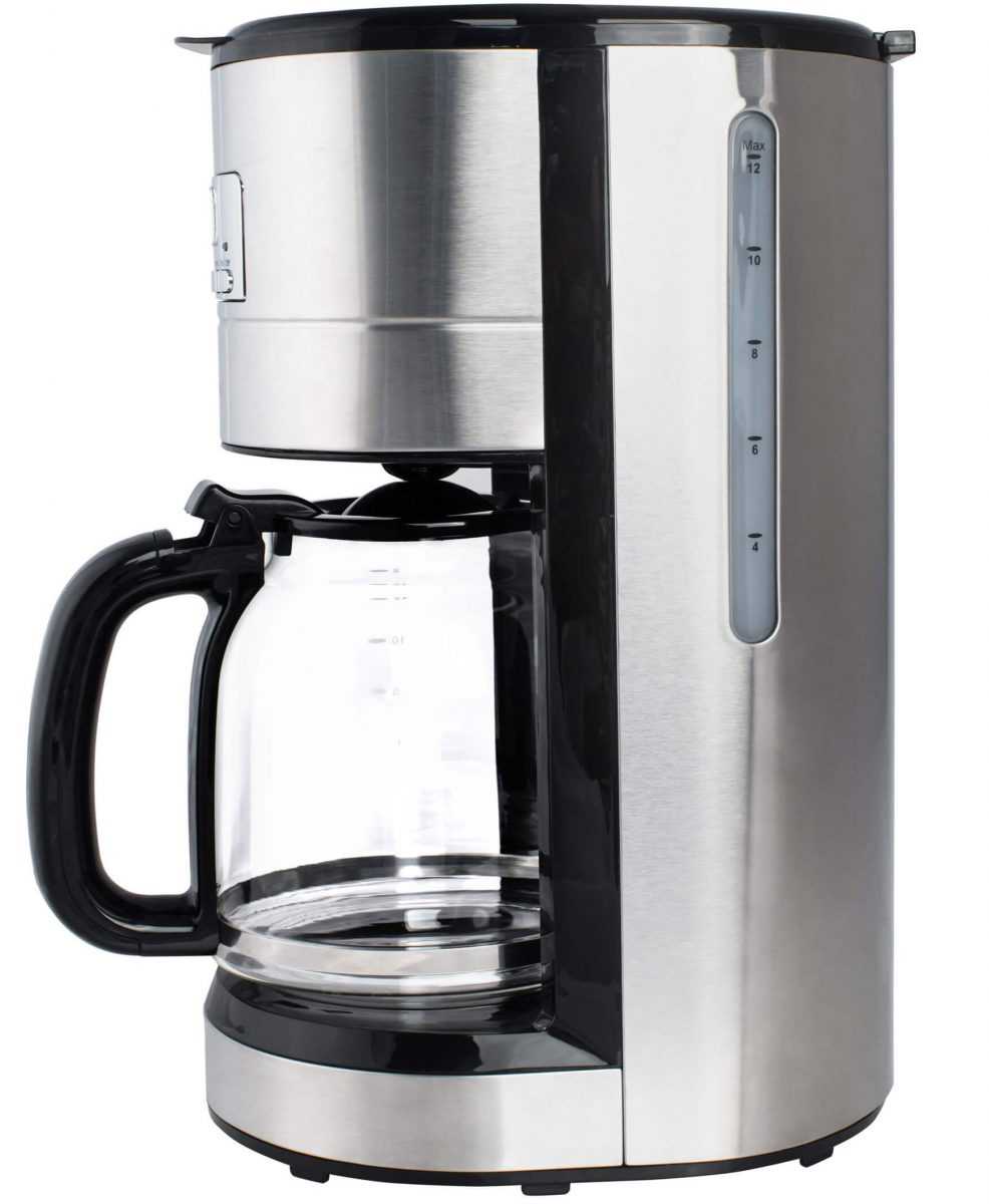 Данное устройство представляет собой стандартную кофеварку капельного типа, представленную в аккуратном дизайне с черным цветовым решением. Максимальный объем составляет 1200 мл и этого вполне хватит на целых 10 порций вкусного кофе. Компактный корпус выполнен из пластика и получил удобную панель управления, а внутри оснащен плитой автоподогрева чашек.