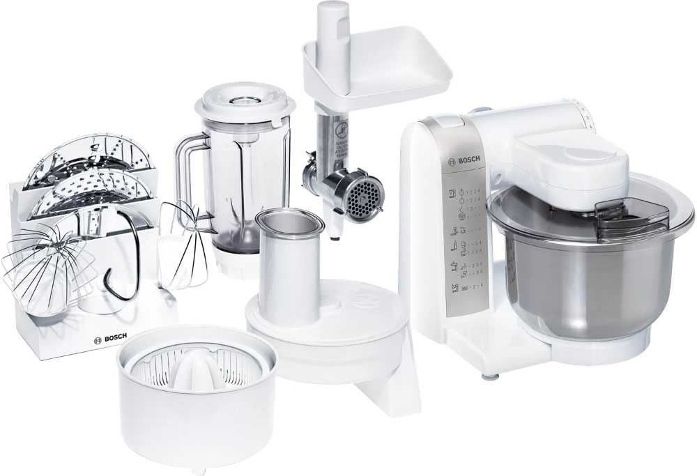 Прорезиненные ножки обеспечивают устойчивость во время работы. Есть автопарковка для насадок и защита от перегрузки. В комплекте имеется мясорубка, пластиковый блендер 1,25 л, терки, насадки для теста, венчик, диск для картошки фри, насадка для нарезки кубиками. Это позволяет замешивать тесто, измельчать мясо, делать фигурную нарезку и готовить множество блюд. Всего за одну загрузку в чаше можно замешать 2,7 кг жидкого теста или 1,9 кг дрожжевого.