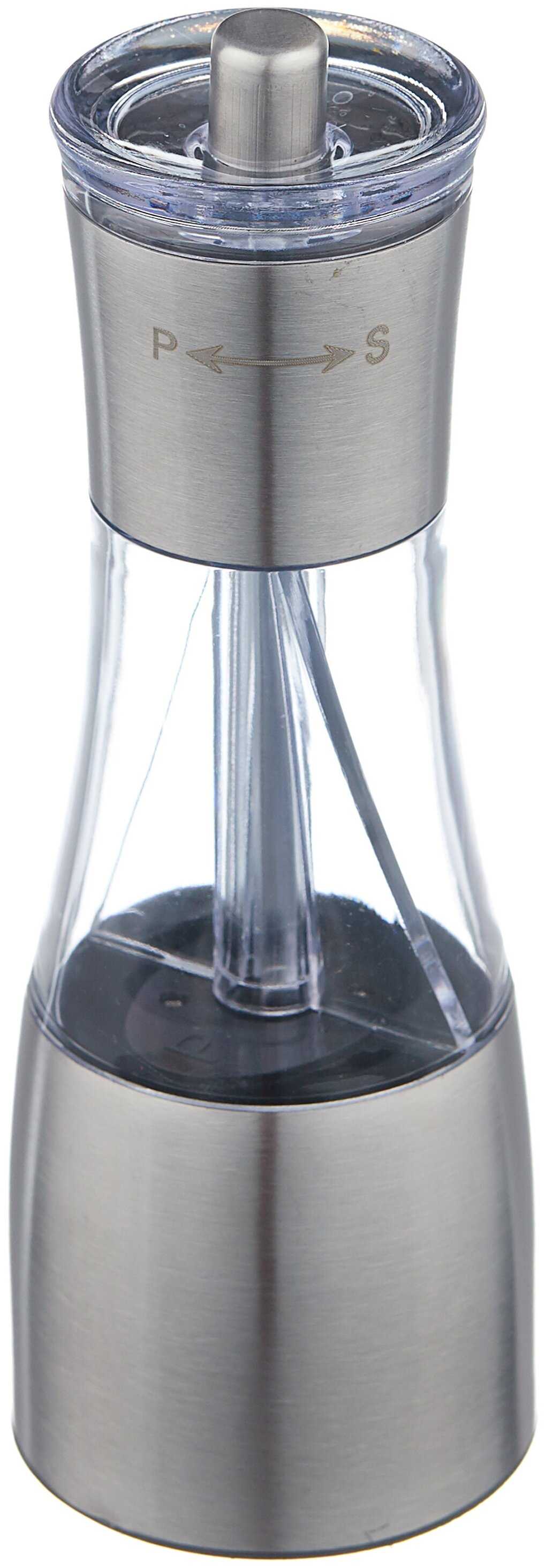 Электрическая мельница для перца серебристого цвета можно использовать для измельчения крупной морской соли или хранения специй. Чтобы приправить блюдо, необходимо взять предмет с тарелки и нажать кнопку. Измельчитель одновременно измельчает и дозирует компонент в контейнер.