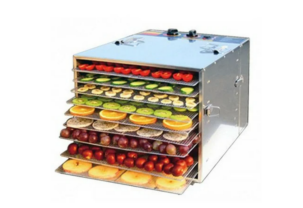 Комфортная для применения сушилка с большой вместительностью, инфракрасным излучением и потенциалом в 800 Вт. Комплект включает четыре поддона, вмещающих до 4 кг сырых продуктов, включая грибы, плоды, ягоды и травы. Все комплектующие выполнены из прочного металла, тогда как рабочая температура составляет 40-70 градусов. Дегидратор достаточно габаритный, имея вес около 14 кг. Настройка температуры происходит посредством использования поворотного регулятора на корпусе.