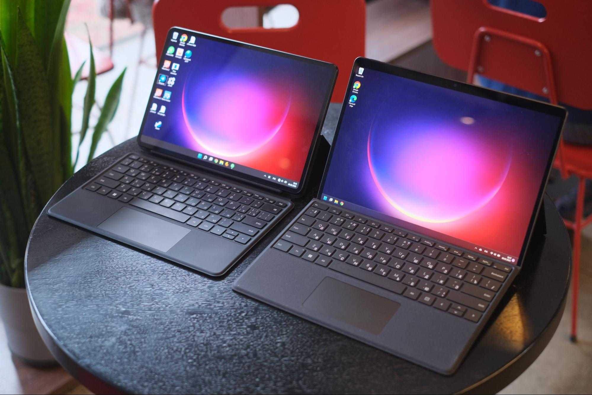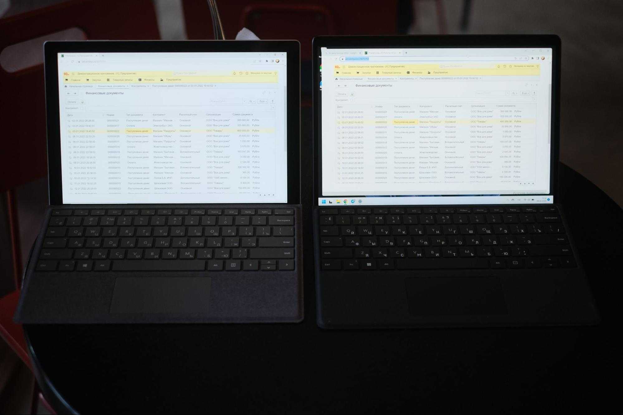 Слева — Surface Pro 7+, справа — Surface Pro 9. Экран на «девятке» ощущается немного качественнее, рамки чуть тоньше. В остальном существенной разницы нет