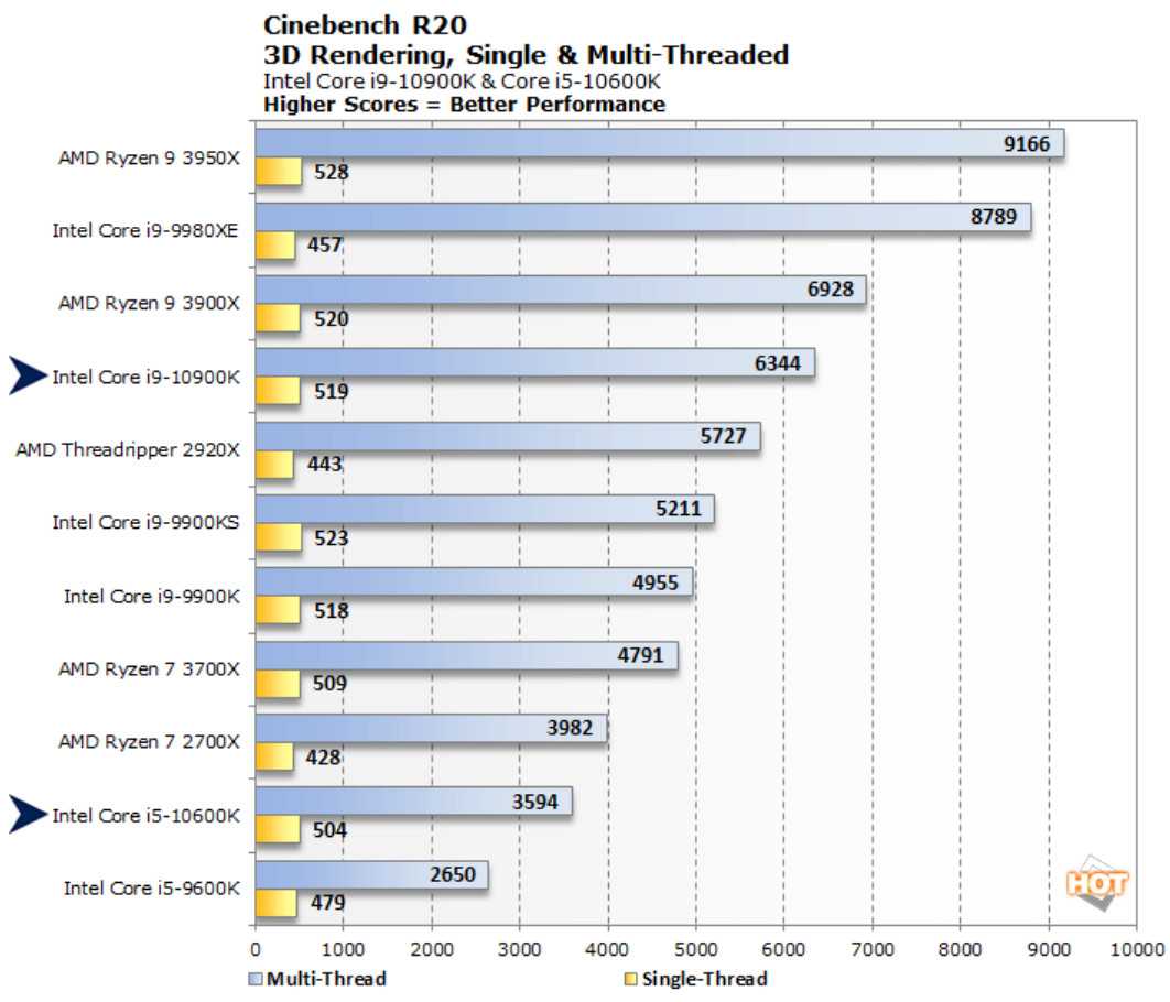 Есть пара моментов, которые необходимо учитывать, чтобы адекватно суммировать производительность Core i9-10900K и Core i5-10600K. Core i5-10600K является достойным обновлением 5-9600K предыдущего поколения с точки зрения как однопоточной, так и многопоточной производительности. Его более высокая базовая и повышенная тактовая частота повышают однопоточную производительность на пару ступеней,и эти тактовые частоты в сочетании с некоторыми дополнительными ядрами и поддержкой HyperThreading делают 10600K значительно быстрее в большинстве многопоточных рабочих нагрузок — это лучший универсальный ЦП, чем 9600K для всего, от игр до создания контента. По сравнению с процессорами AMD Ryzen, Core i5-10600K значительно уступает Ryzen 7 3700X и примерно на одном уровне с 2700X.