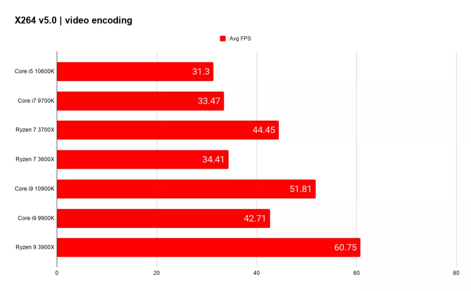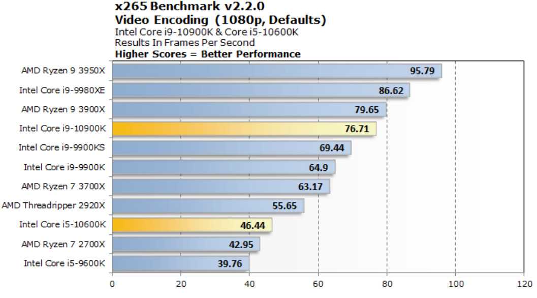В этом тесте кодирования видео мы снова видим, что 10-ядерный Core i9-10900K почти догоняет 12-ядерный Ryzen 9 3900X и явно обгоняет Core i9-9900KS . Core i5-10600K также хорошо работает, что и представляет собой огромное обновление по сравнению с 9-м поколением Core i5.