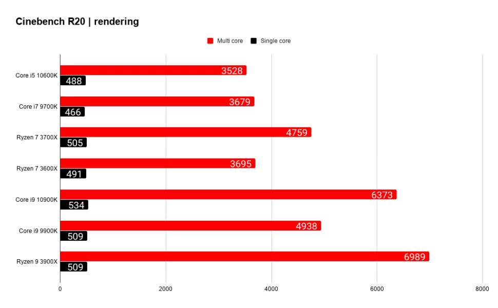 Тест производительности рендеринга Cinebench на базе Cinema 4D от Maxon. Cinema 4D — это набор инструментов для 3D-рендеринга и анимации, который используется анимационными компаниями и такими производителями, как Sony Animation и многими другими. Он очень требователен к ресурсам системного процессора и может использовать любое количество потоков, что делает его отличным показателем вычислительной производительности. Это многопоточный, многопроцессорный, ориентированный на тест, который визуализирует и анимирует трехмерные сцены и отслеживает длительность всего процесса. Скорость, с которой каждая тестовая система смогла визуализировать всю сцену, представлена на графиках ниже. Здесь Core i9-10900K показывает однопоточную производительность, а также многопоточность, которая уступает 12-ядерному Ryzen 9 3900X. Core i5-10600K находится сразу за 8-ядерным Ryzen 7 2700X.