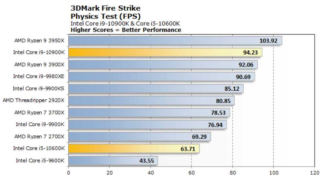 Тесты физики многопоточных игр 3DMark показывают, что Core i9-10900K опережает Ryzen 9 3900X, но не смог поймать монстра, 16-ядерный 3950X. Core i5-10600K демонстрирует огромный скачок по сравнению с предыдущим поколением, но в конечном итоге он не смог поймать более мощные 8-ядерные процессоры.