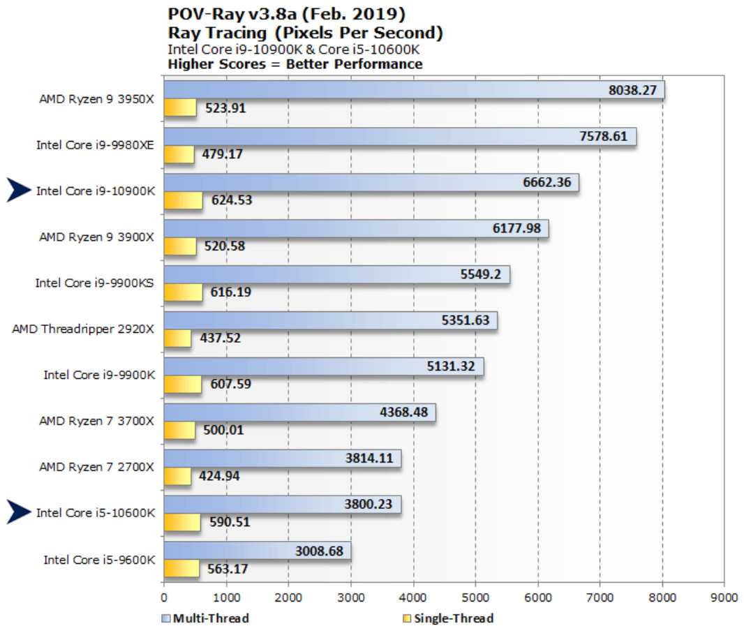 Мы протестировали с помощью стандартных инструментов POV-Ray ‘one-CPU’ и ‘all-CPU’ на всех наших тестовых машинах. Результаты измеряются в пикселях в секунду; чем выше балл, тем выше производительность. По сути, мы видим ту же историю, что и Cinebench, по крайней мере, по большей части. В этом приложении Core i9-10900K опережает Ryzen 9 3900X.