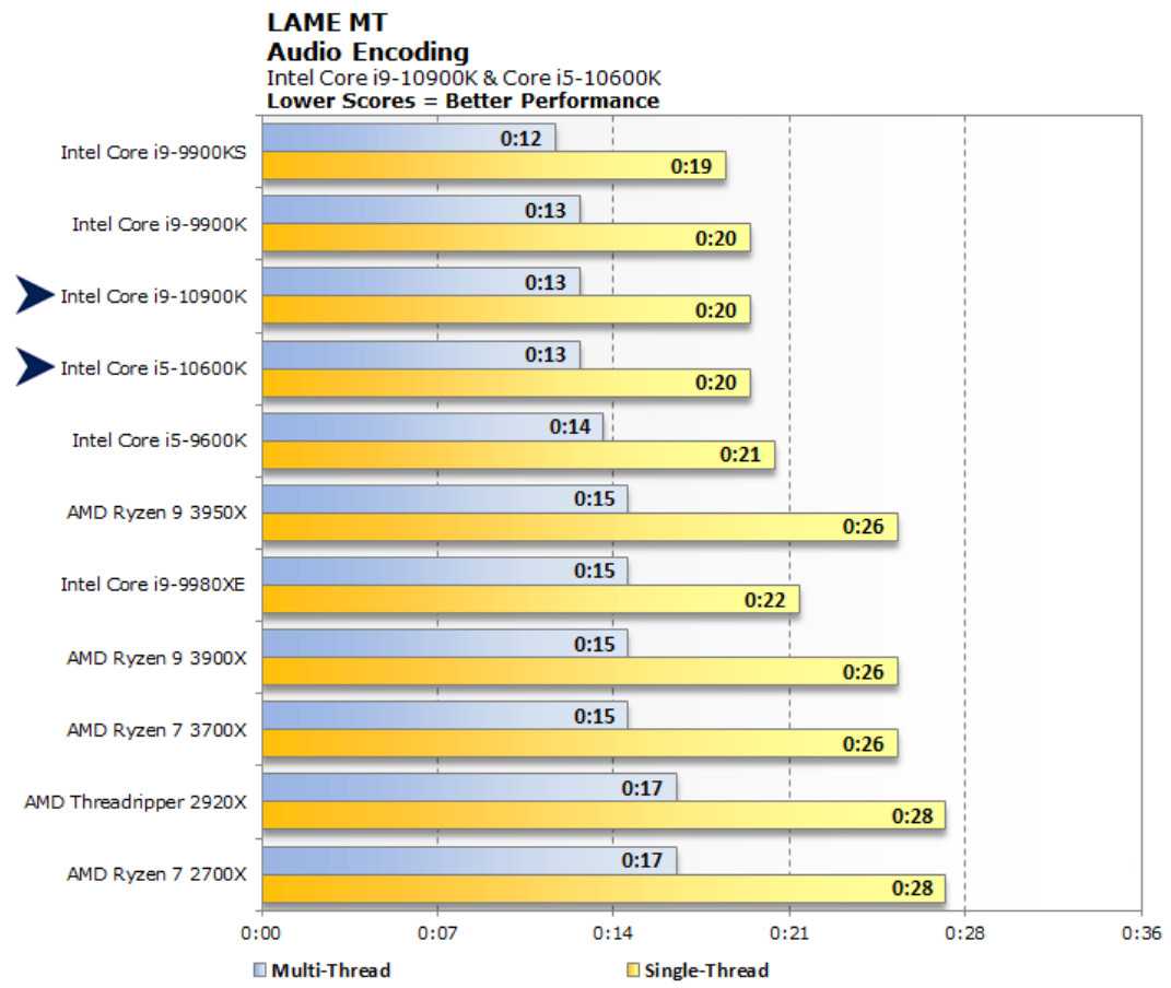 Для этого теста мы создали собственный WAV-файл размером 223 МБ и преобразовали его в формат MP3, используя многопоточный инструмент LAME MT в однопоточном и многопоточном режимах. Время обработки указано в секундах. Более короткое время соответствует лучшей производительности.