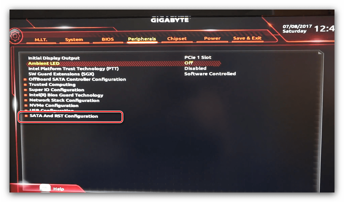 - Режим AHCI, необходимый для современных HDD и SSD, включается на вкладке «Peripherals», в разделах «SATA and RST Configuration» – «SATA Mode Selection».
