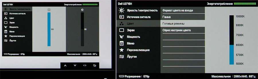 Имеются стандартные настройки яркости, контрастности и резкости. Есть 2 профиля гамма-коррекции для ПК и «яблочных» компьютеров, которые определяют цветовой баланс. Также сменить ББ можно через один из профилей цветовой температуры или ручной регулировкой. Часть профилей открывает доступ к настройкам оттенка, насыщенности и динамической контрастности.Изображение может перестраиваться в различных соотношениях. В их числе 4:3, 5:4 и растяжением картинки на весь экран. В случае HDMI-подключения, поддерживалось разрешение до 2560х1440 при 60 Гц. Что касается шкалы серого, то на ней можно было различить любые градации оттенков серого, за исключением ближайшей к черному.