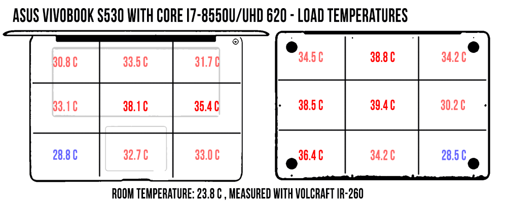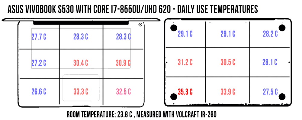 There’s very little to complain when it comes to the outer-shell temperatures as well, both with daily use and with games, as you can see in the pictures below. Just keep in mind the GPU performance suffered on our sample, so retail units might run a little hotter with demanding loads.