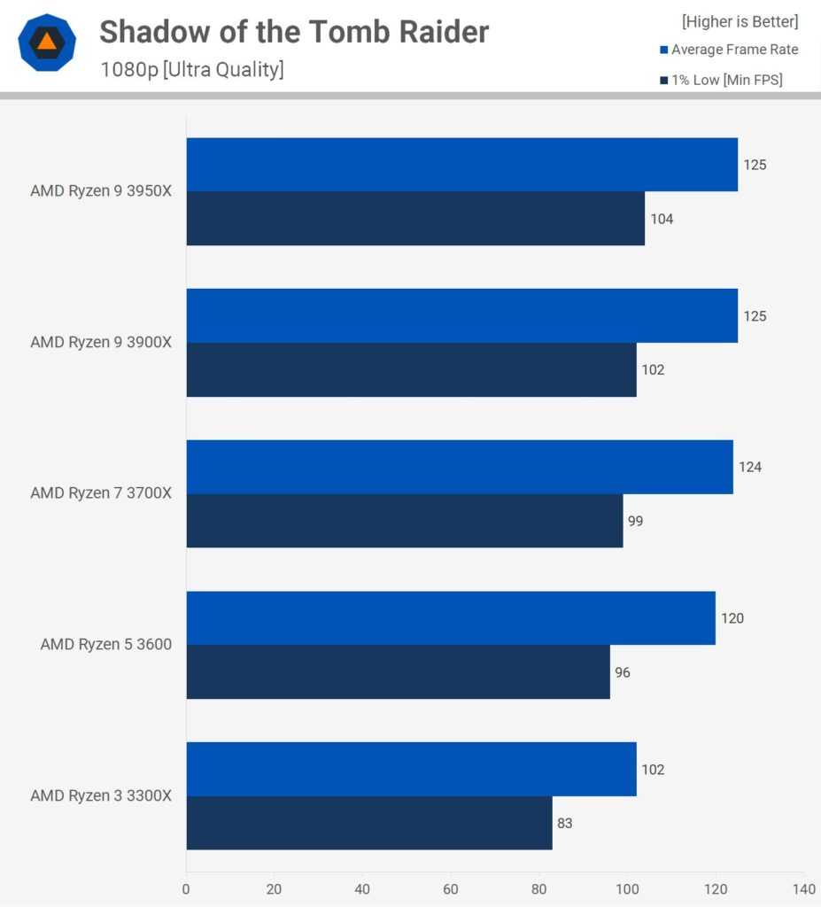 Shadow of The Tomb Raider можно использовать как пример очень требовательной к процессору игры. Здесь мы видим значительный прирост производительности при переходе от Ryzen 3 3300X к Ryzen 5 3600. Разница в скорости составляет почти 20%. Если ядер больше шести, прирост скорости становится минимальным.