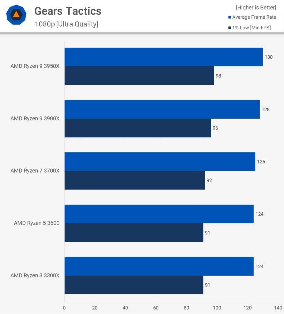 В игре Gears Tactics положение немного отличается. Здесь преимущество может быть связано с одноядерной производительностью, поскольку 3300X соответствует 3600 и даже Ryzen 9. В них незначительное преимущество в тактовой частоте даёт очень малый прирост производительности.