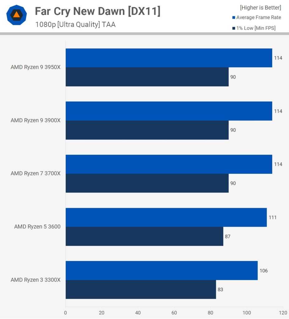 В игре Far Cry New Dawn мы снова видим ситуацию, где 3600 показывает себя чуть быстрее по сравнению с 3300X благодаря двум дополнительным ядрам. 3700X снова выглядит намного быстрее, но дальше преимущество в производительности в 12 и 16-ядерных процессорах перестаёт быть значительным.
