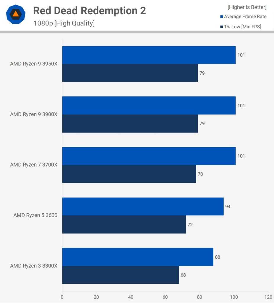 Red Dead Redemption 2 стала ещё одной чувствительной к процессору игрой. Здесь прирост производительности наблюдается вплоть до 8-ядерного 3700X. Игра очень хорошо идёт 3300X без заметных подтормаживаний, поэтому даже бюджетные видеокарты приводят к минимальному приросту производительности между разными процессорами. Чтобы получить максимум производительности, хватит 3700X.