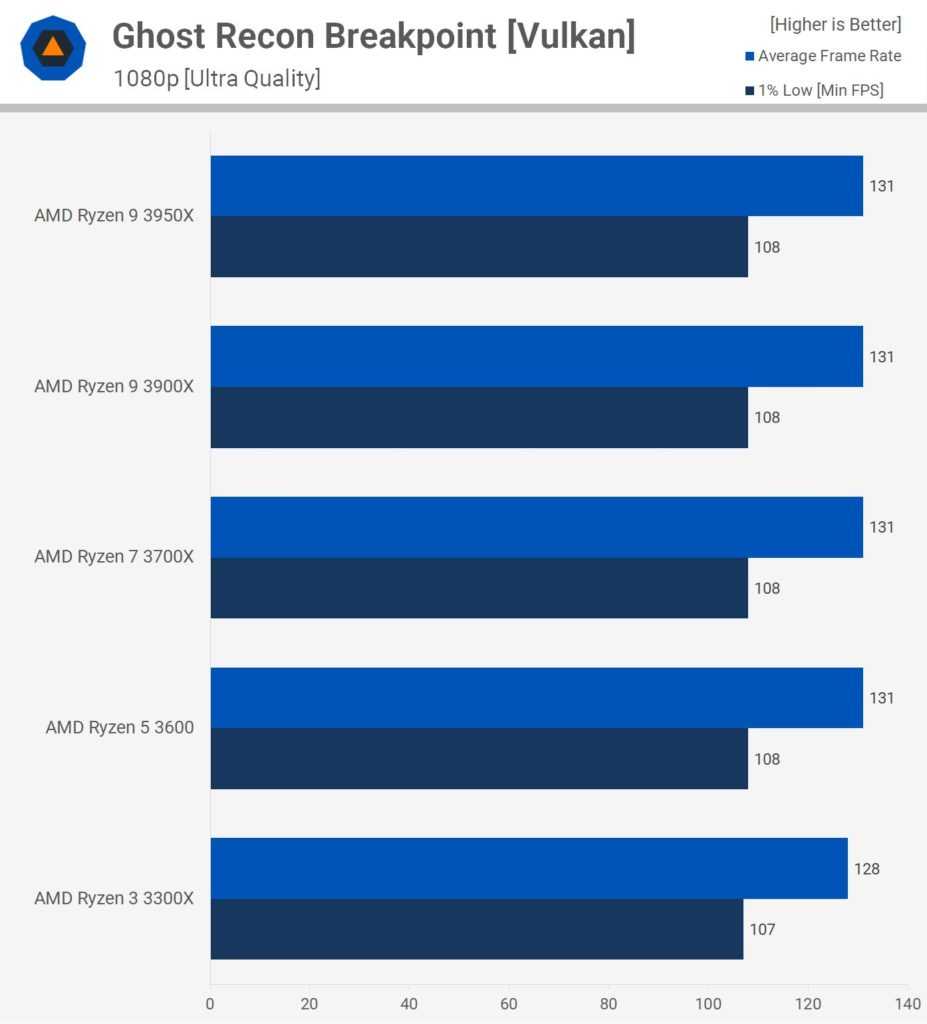 Дальше идёт игра Ghost Recon Breakpoint, не слишком чувствительная к процессорам. Тут достаточно приличного 4-ядерного чипа с поддержкой SMT, каковым и является 3300X.