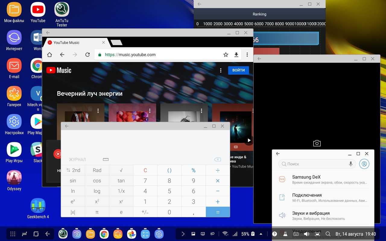 Отдельного упоминания заслуживает Samsung DeX — специальный режим, в котором интерфейс планшета начинает напоминать Windows с её многооконным интерфейсом, позволяющим очень удобно работать в нескольких приложениях одновременно. Причём тут функционал окон даже шире, чем в оригинале: им можно настраивать прозрачность, а также закреплять, чтобы при переключении в другое окно закреплённое все равно оставалось на переднем плане. Потенциал DeX в полной мере должен раскрываться при подключении клавиатуры, но у меня ее не было и поэтому оценить его я не смог.