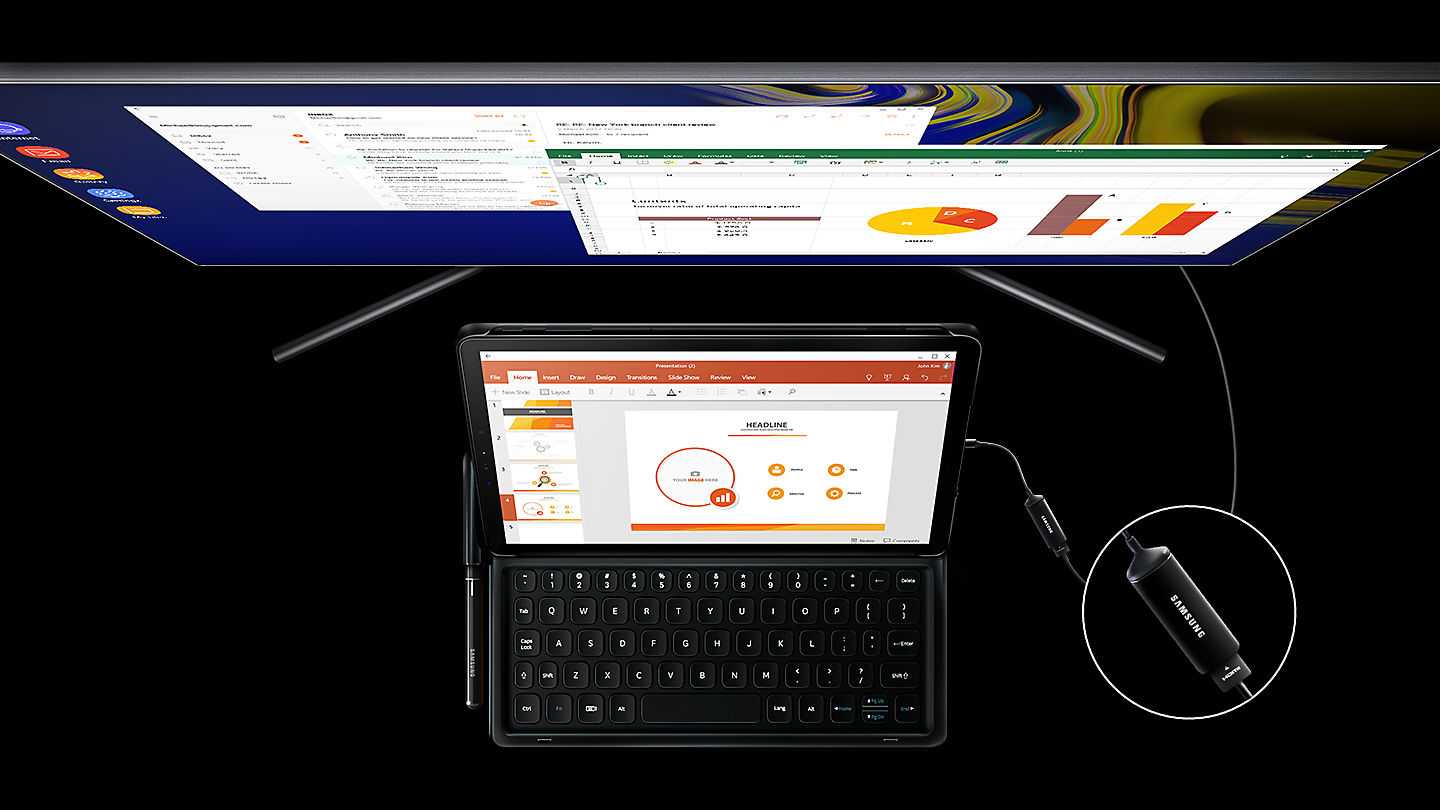 Как и Note 9, S4 с помощью специального маленького адаптера можно подключить к монитору, добавляем к этому комплекту мышку, клавиатуру — и вот вам комплект для работы. Я отдельно подчеркну: это маленький специальный HDMI адаптер, а не какая-то огромная станция. Каждое приложение можно запускать в полноэкранном режиме (КАЖДОЕ!), планшет может работать как тачпад или в режиме второго экрана, ну и для коучей это круто. На мониторе презентация, связь через планшет, хочешь — видео, хочешь — голосом объясняй что и как.