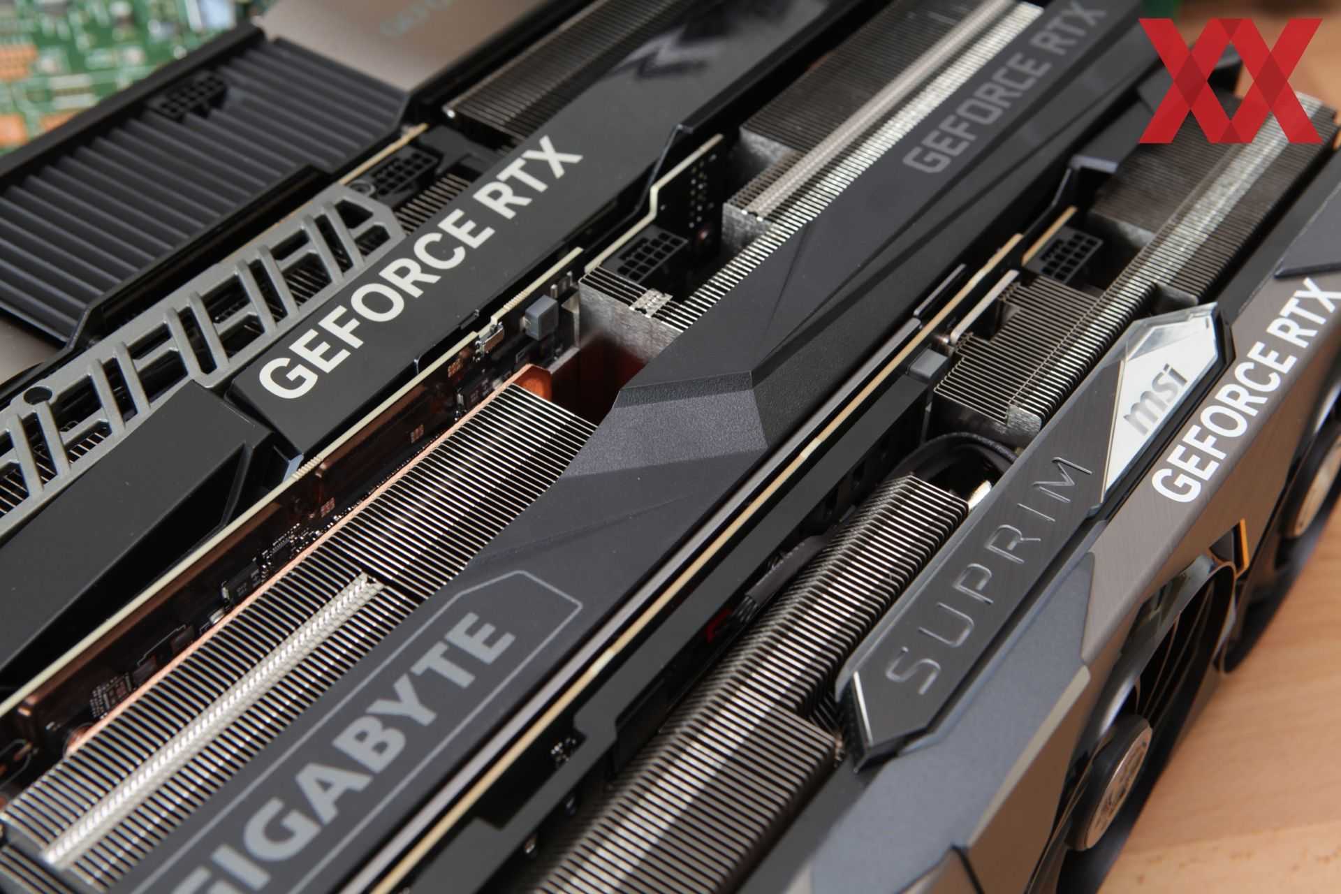 При этом заявленный в характеристиках максимальный уровень TDP здесь точно такой же — 215 ватт, а рекомендуемая мощность блока питания для системы с одной такой видеокартой заявлена на отметке в 650 ватт (но это с приличным запасом, если, конечно, вы не собираетесь использовать этот ускоритель вместе с Intel Core i9-10980XE Extreme Edition).