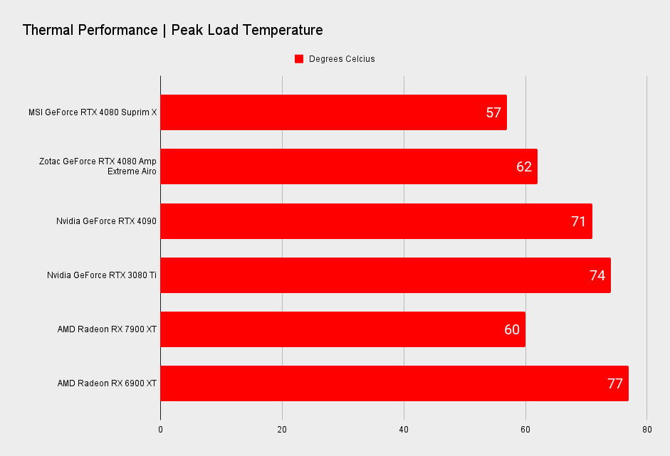 Чудовищный кулер Suprim X действительно доставляет удовольствие. Пиковая температура 57 ° C — одна из лучших, которые я когда-либо видел для любого графического процессора, высокого класса или нет. Это на целых пять градусов холоднее, чем у Zotac Airo. И он справляется с этим, оставаясь при этом почти безмолвным. Вентиляторы процессорного кулера и помпа на моей тестовой платформе более заметны. По общему признанию, 57 ° C находится на открытом тестовом стенде, поэтому в случае вашего случая температура будет немного выше, но даже в середине 60-х годов это все равно будет выдающимся результатом для 320-ваттного графического процессора.