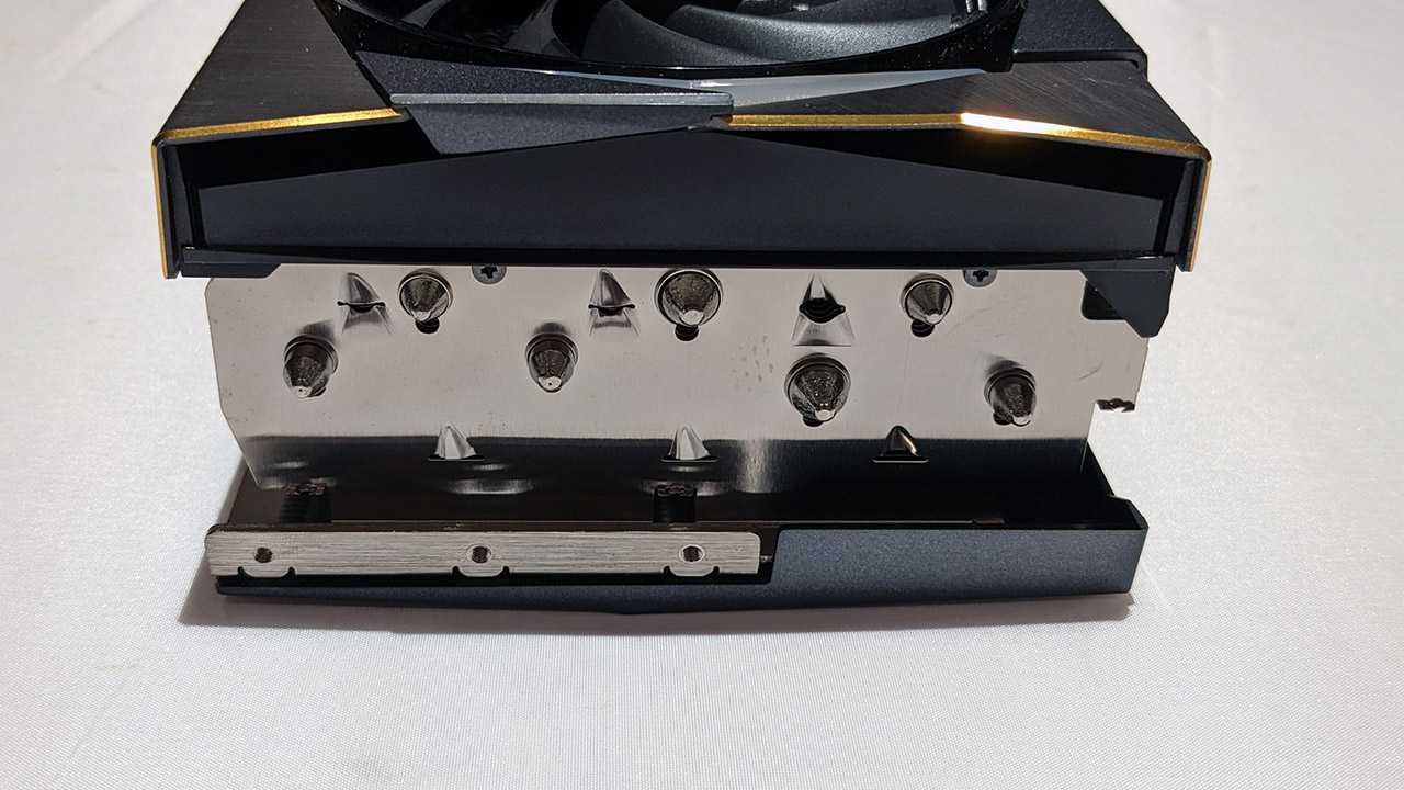 А теперь взгляните на этот кулер! AD103 никогда не сойдет с рук с однослотовым кулером, но при 320 Вт он не представляет проблемы для кулера класса Suprim X 450 Вт + RTX 3090 Ti/ 4090. Он основан на испарительной камере с не менее чем десятью тепловыми трубками, рассеивающими тепло на дальние участки его массивной поверхности.