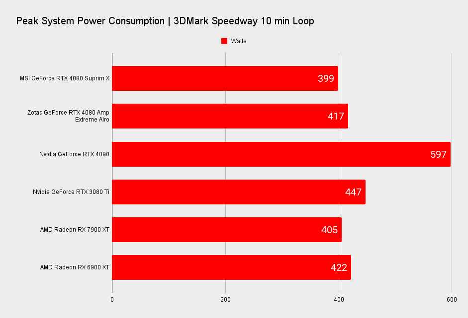 Одним из самых впечатляющих достижений RTX 4080 является относительно низкое энергопотребление, а точнее производительность на ватт. Я зафиксировал максимальное энергопотребление системы в 399 Вт для Suprim X. Это ниже, чем у Zotac RTX 4080, RTX 3080, RX 6900 XT и даже RX 7900 XT. Несмотря на все предварительные слухи о безудержном энергопотреблении серии RTX 40, RTX 4080 обеспечивает лучшую энергоэффективность среди всех карт, выпущенных на сегодняшний день.