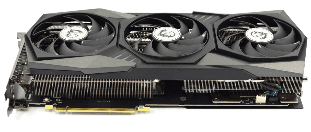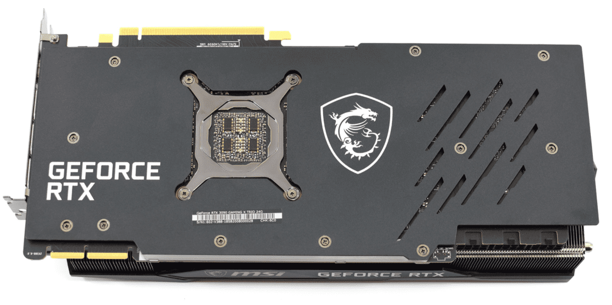 Единственное изменение в физическом дизайне карты по сравнению с ее аналогом RTX 3080 — это задняя панель. В RTX 3080 Gaming X Trio MSI использует композитный графен для задней панели, но он был удален в пользу металлической задней панели (бэкплейта), как мы увидим ниже.