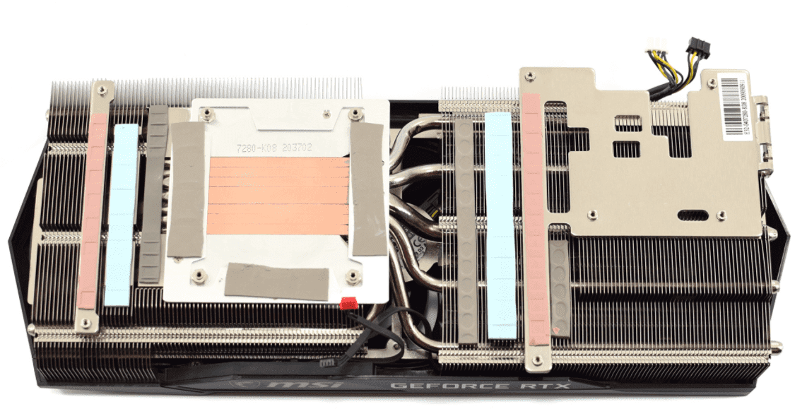 Что касается радиатора, он не изменился по сравнению с RTX 3080 Gaming X Trio. Это означает, что у нас есть два отдельных алюминиевых ребер решетки радиатора соединеных 6×6-миллиметровыми никелированными медными тепловыми трубками, седьмая тепловая трубка имеет размер 8 мм.