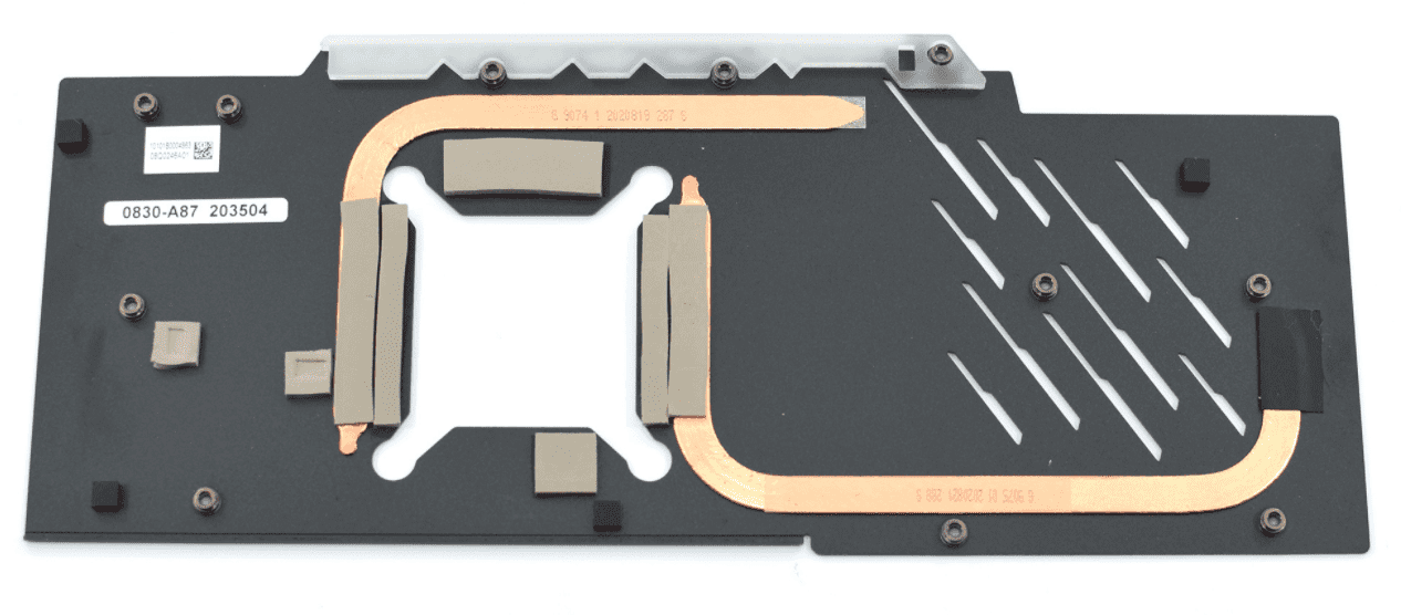 В основании используется медная никелированная пластина с шестью тепловыми трубками диаметром 6 мм каждая. Подошва радиатора накрывает графический процессор, чипы памяти и все два ряда силовых элементов, разбросанных по обе стороны от GPU.