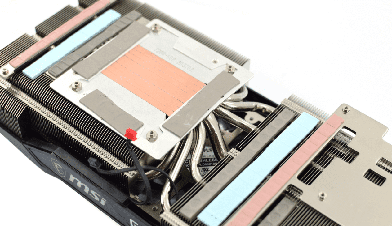 Эти трубки напрямую контактируют с GPU, причем самая толстая находится прямо посередине, а память и VRM контактируют с дополнительными пластинами через термопрокладки.