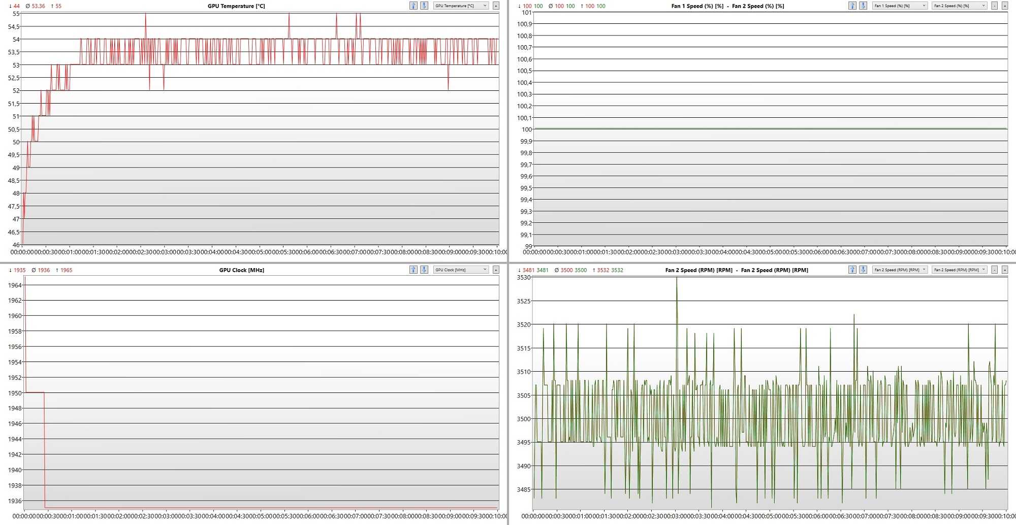 Температура за всё время теста лишь несколько раз поднималась до 55 °С. Хороший потенциал охлаждения, но на 3500 об/мин шум от видеокарты легко спутать с пылесосом.