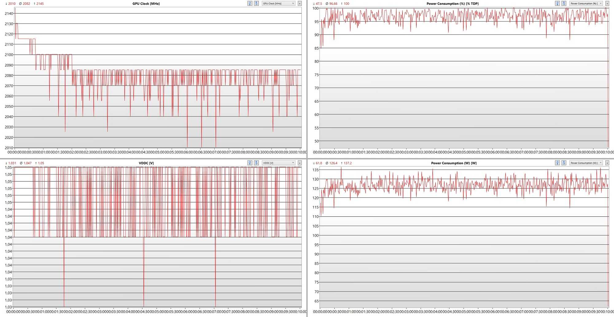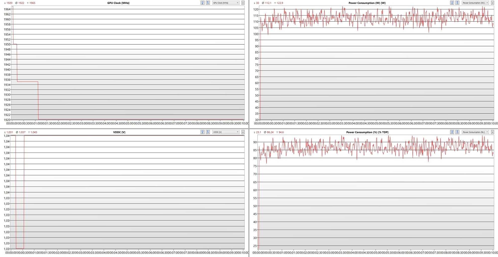 Большую часть теста частота графического процессора держалась на отметке 1920 МГц при напряжении 1.043 В, в максимуме достигнув 1965 МГц. Среднее энергопотребление составило 112.1 Вт (86.2%), максимальное — 123 Вт (94.6%).
