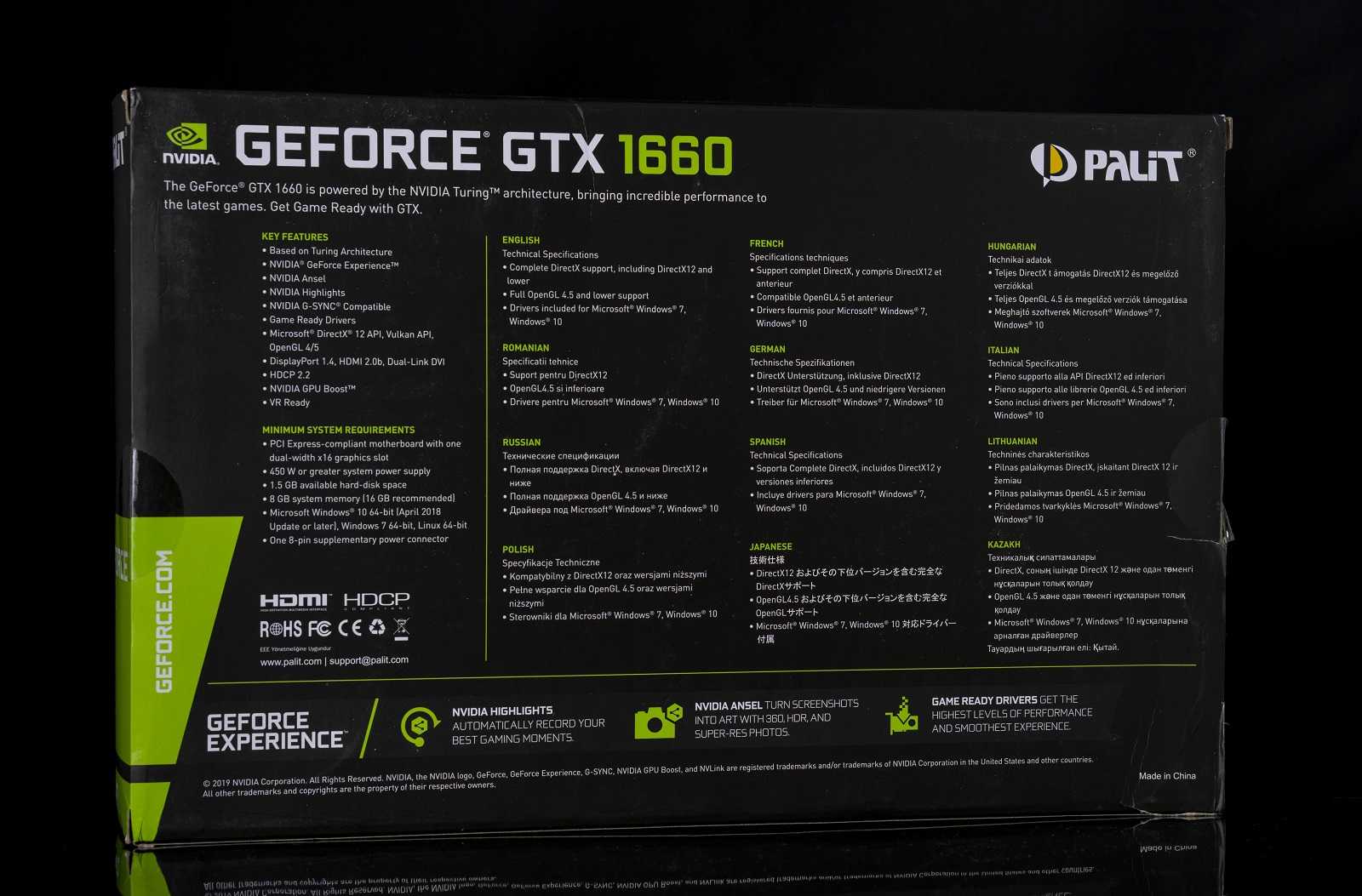 На обратной стороне находится описание ключевых особенностей GTX 1660, указаны минимальные системные требования, описаны технические возможности.