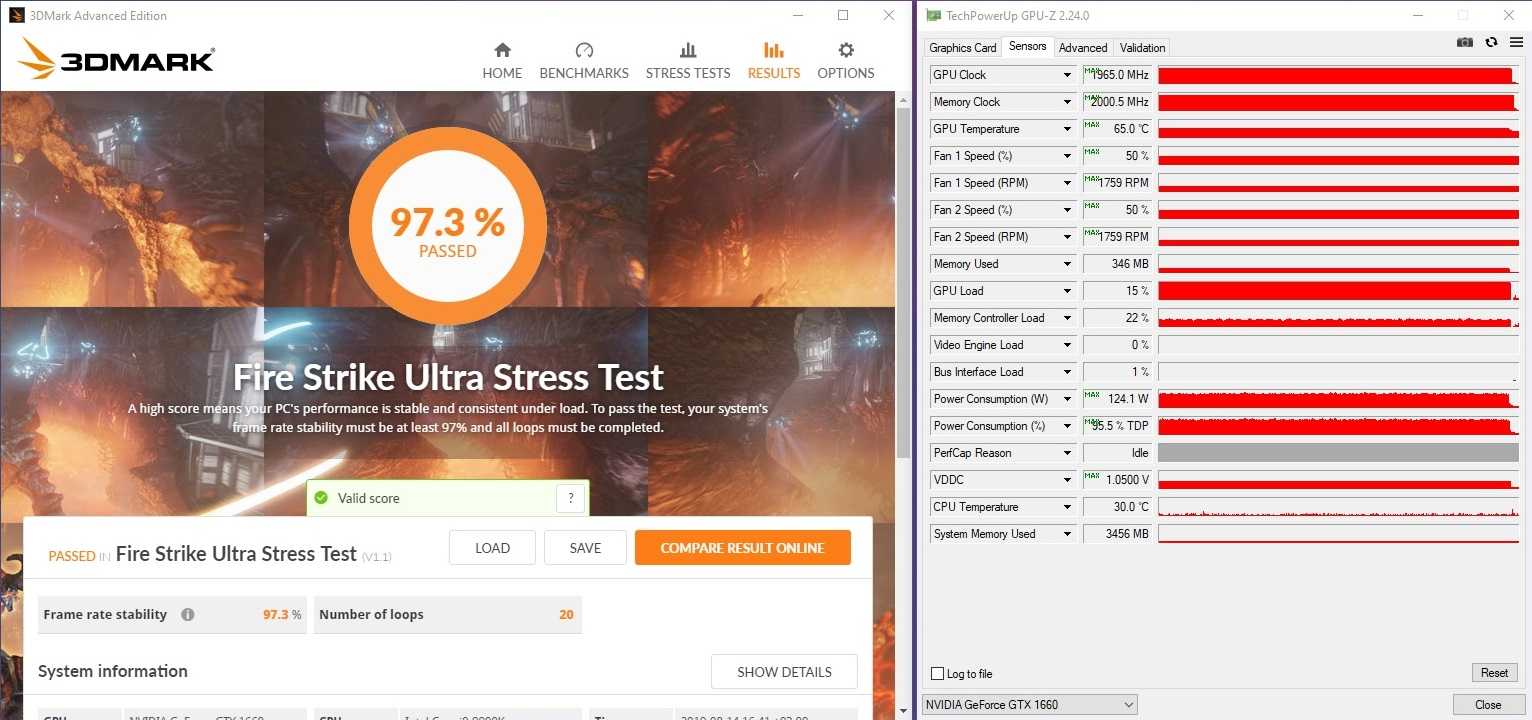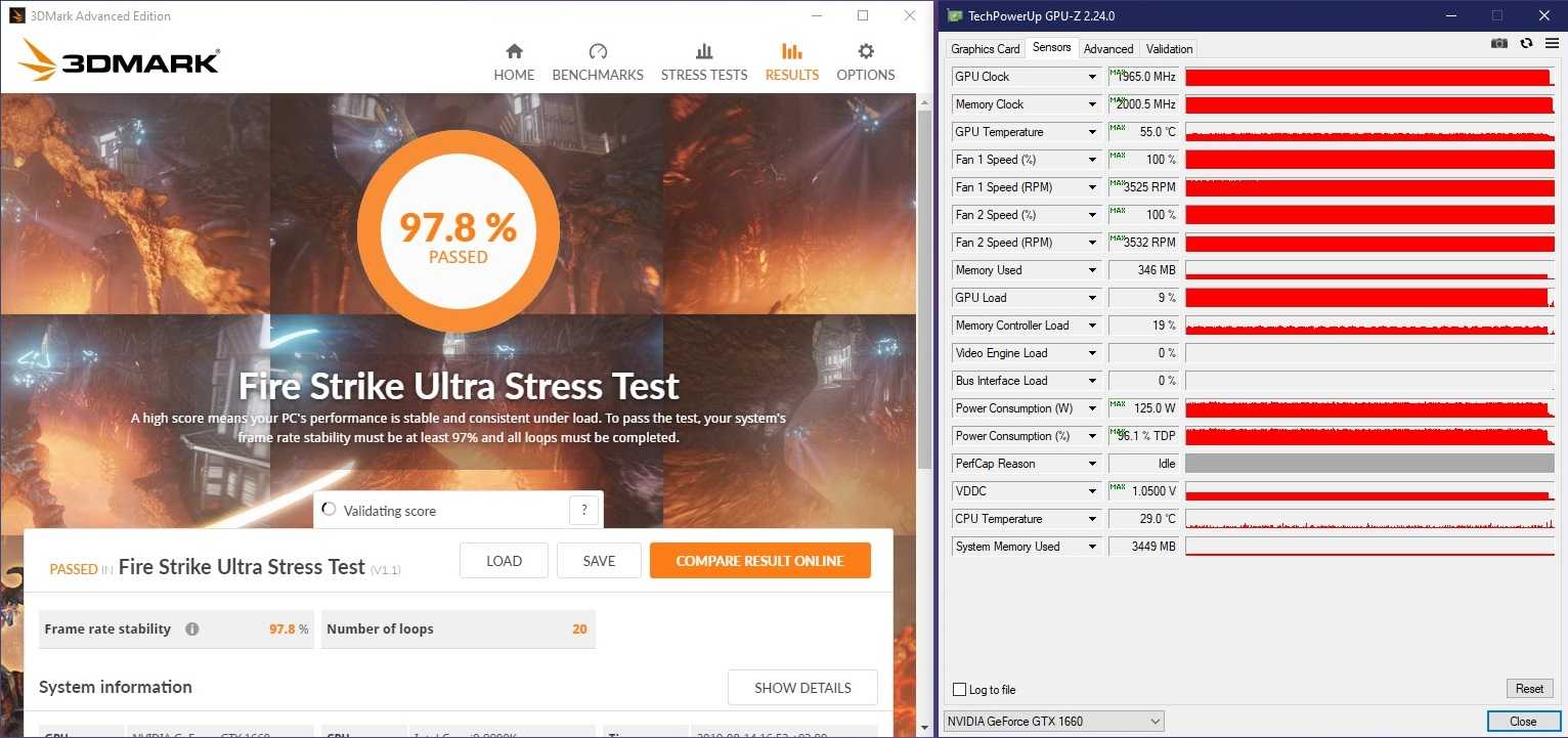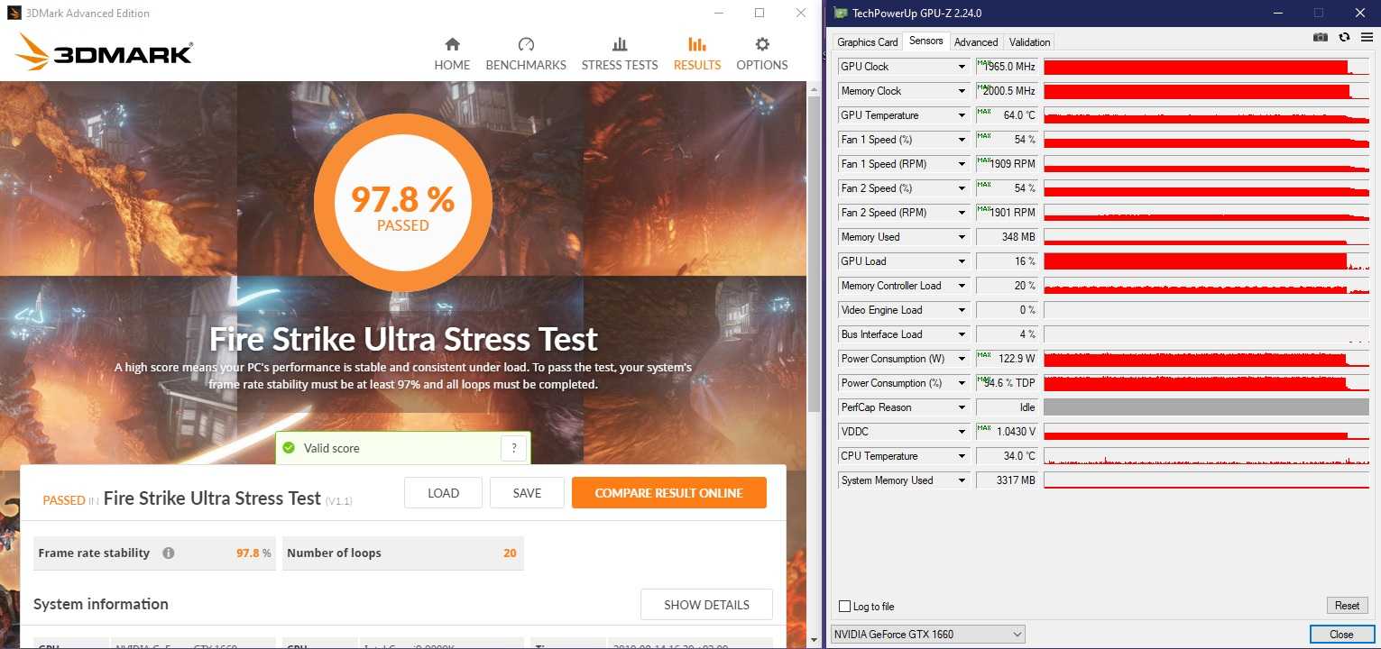 На настройках по умолчанию в тесте стабильности Fire Strike Ultra GTX 1660 Dual OC показал отличную стабильность, при этом не превышая лимиты энергопотребления.