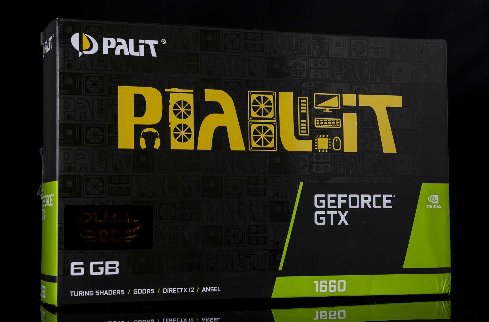 Palit GeForce GTX 1660 Dual OC поставляется в небольшой картонной коробке габаритами 344х223х65 мм.