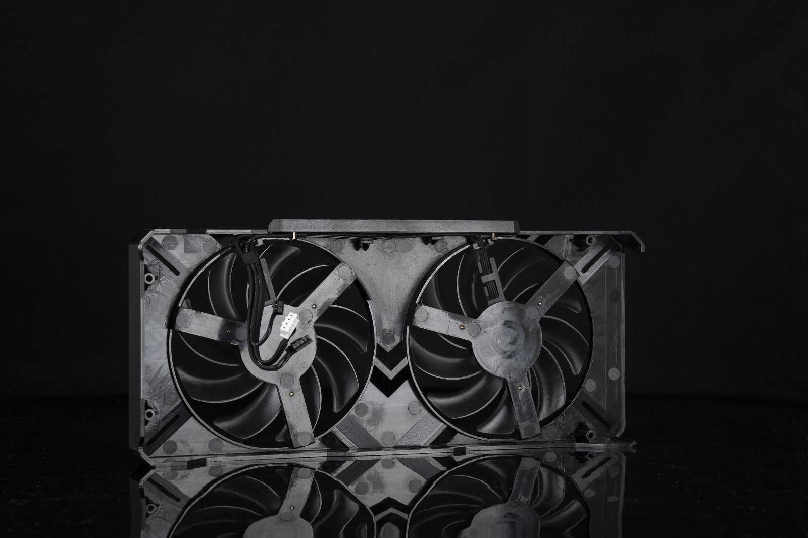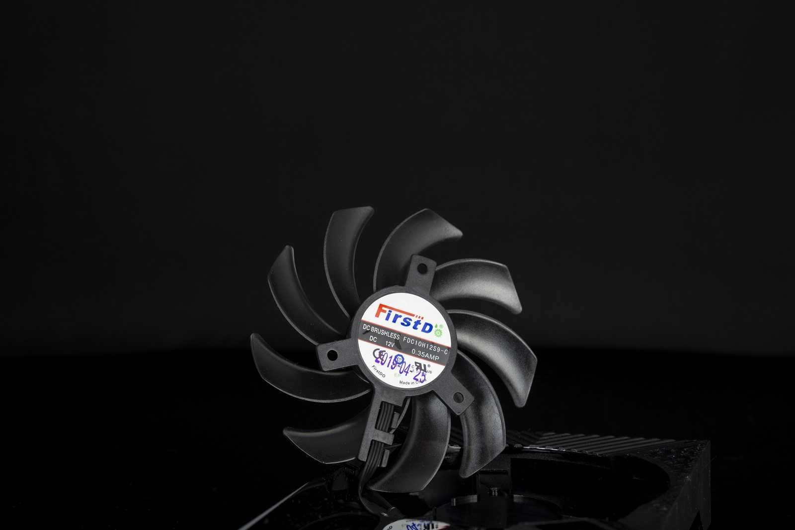 Два осевых вентилятора имеют диаметр 85 мм. В режиме бездействия они не останавливаются, продолжая вращаться на 1.000 об/мин. Под нагрузкой скорость увеличивается до 1.975 об/мин. Честно говоря, с учетом малого тепловыделения (даже под нагрузкой), хотелось бы получить полупассивную работу вентиляторов. Но производители видеокарт оставляют данную функцию только для премиальных моделей.
